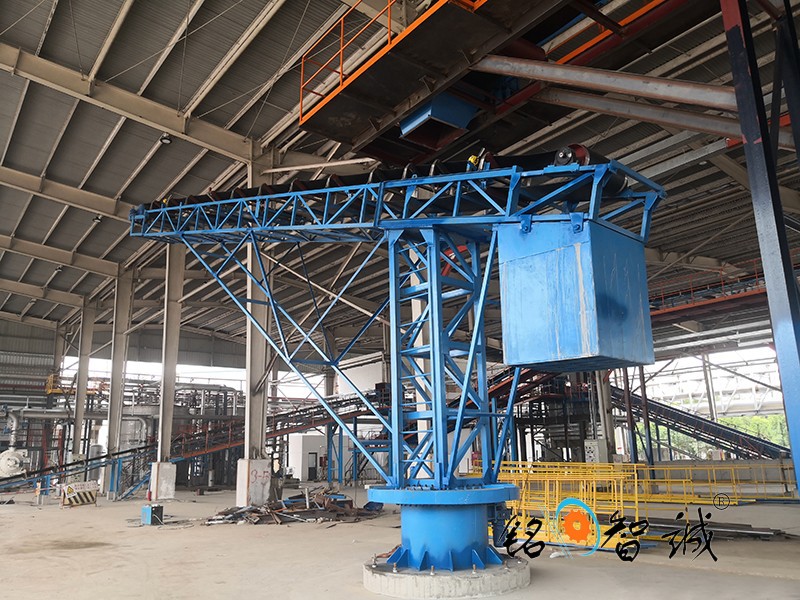 旋轉(zhuǎn)式皮帶輸送機(jī),為散碎物料倉(cāng)貯輸送設(shè)備,是在安裝有行走輪的支架上部的底盤(pán)上安裝一轉(zhuǎn)盤(pán),轉(zhuǎn)盤(pán)可相對(duì)底盤(pán)作旋轉(zhuǎn)運(yùn)動(dòng),皮帶輸送機(jī)的進(jìn)料端座在轉(zhuǎn)盤(pán)頂部的托盤(pán)上,出料端為懸臂式,配重箱在托盤(pán)上用以上與懸臂配重,倉(cāng)貯時(shí),物料通過(guò)料斗由輸送帶送至遠(yuǎn)端,推動(dòng)懸臂即可改變堆積位置,在庫(kù)房?jī)?nèi)實(shí)現(xiàn)多點(diǎn)堆積而勿需停機(jī)和移動(dòng)機(jī)體,連續(xù)作業(yè)省時(shí)省力,操作方便,尤其適用于糧食的倉(cāng)貯輸送。